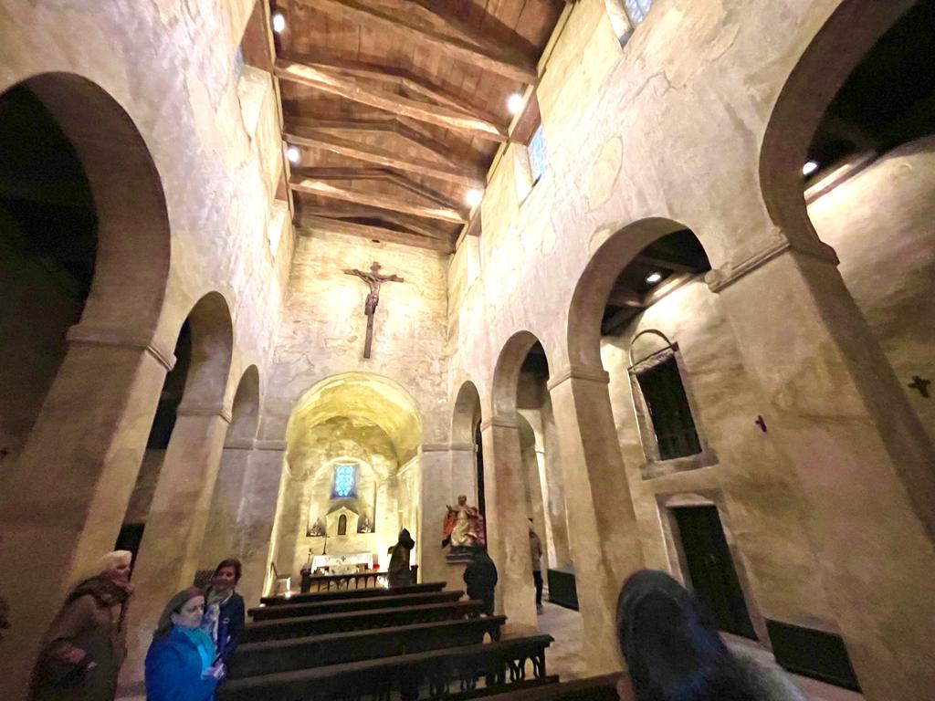En esta ocasión, un grupo de treinta personas, la mayoría asociados de Oviedo y Gijón, se dieron cita a las 11:00h de la mañana, en la iglesia de Santo Adriano de Tuñón, iglesia fundada en el 891 por Alfonso III y su esposa Jimena en un lugar estratégico, cabecera de valle, zona abierta, fértil y bien comunicada con Oviedo. Toda ella decorada con pinturas semejantes a las de San Julián de los Prados, y donde la luz natural que se filtra por las celosías de piedra cobra un protagonismo especial.